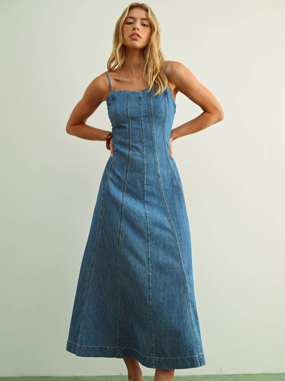 The Daphne Denim Dress is all about effortless cool with a flirty twist. Its square neckline and adjustable straps keep it breezy and ready for anything. The maxi length flows beautifully, giving it a relaxed, easygoing vibe. Throw on sandals or sneakers and you’re set for brunch, strolls, or a sunny day adventure.
