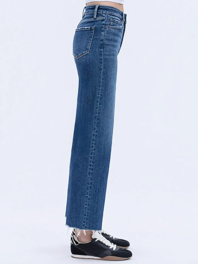 Step into effortless sophistication with the High Rise Wide with Trouser Press jeans. Tailored with a classic trouser press and a flattering front rise, they offer a polished silhouette from day to night. The cotton blend provides just the right amount of stretch, while the wide leg and inseam create a modern, flowy fit that moves with you. Perfect for pairing with sleek heels or casual sneakers.
