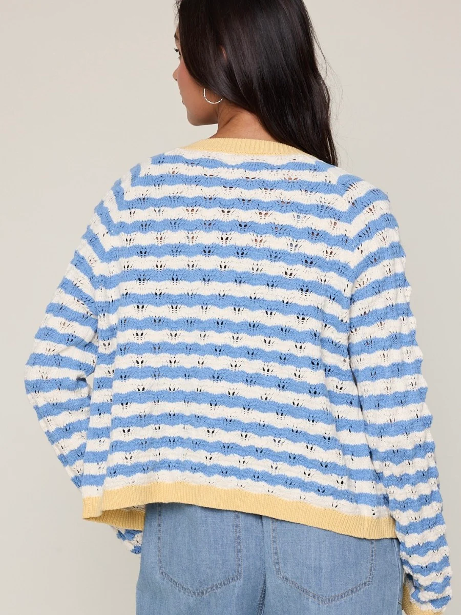 Fresh, classic, and effortlessly wearable, the Natalie Stripe Cardigan brings a pop of pattern to any outfit. The round neckline and button-down front keep it timeless, while contrast trim and front pockets add playful, practical touches. Soft 100% cotton makes it perfect for layering from crisp mornings to cozy evenings.